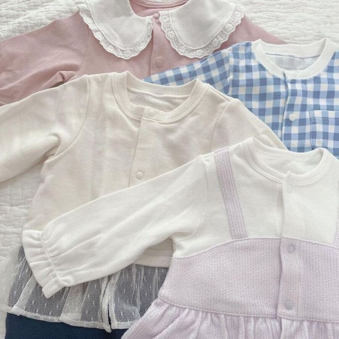 mikan_yf410さんはこちらのキュートなお洋服を4枚ゲット。全てスナップボタンでパッと開きやすいタイプなんだそう。金属アレルギーの赤ちゃんでも安心なプラスチックスナッパーを使用しているようですよ。えり元のレースやギンガムチェック柄、チュール素材など可愛い要素がたっぷり詰まったお洋服たちですね!