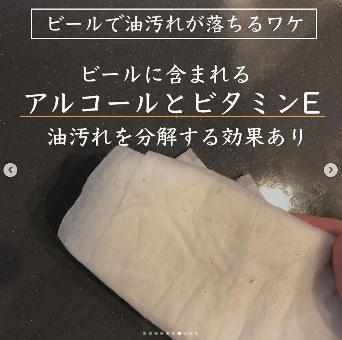 レンゲさんはキッチンペーパーにビールを含ませてコンロのこそうじ(小掃除)。アルコールとビタミンEが油汚れを分解してくれるそうです。晩酌の後に1分だけコンロの拭き掃除をするようにしているんだとか♪