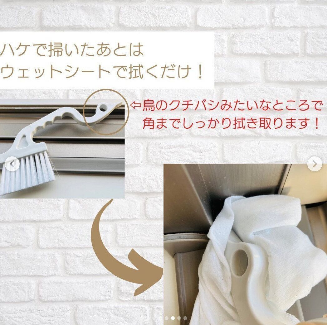 yu.u_roomさんは窓サッシのこそうじ(小掃除)に、DAISOで買ったハケとフローリングウェットシートを活用!あらかじめハケでホコリを掻き出してからシートで拭き取るのが綺麗に掃除をするコツなんだとか。