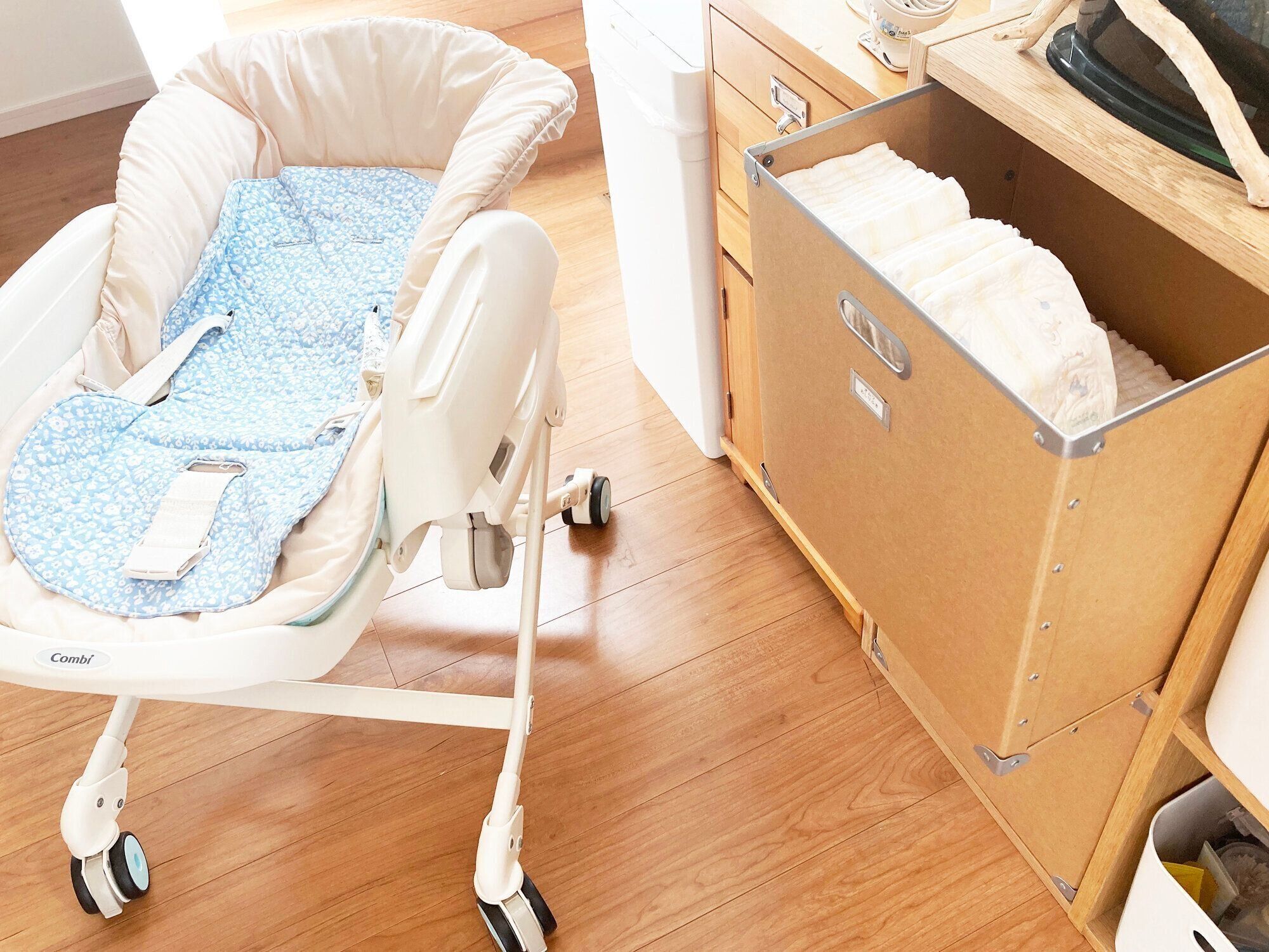 一番頻繁におむつ替えする場所のおむつ収納を、少し大きなボックスにしてみましょう。
