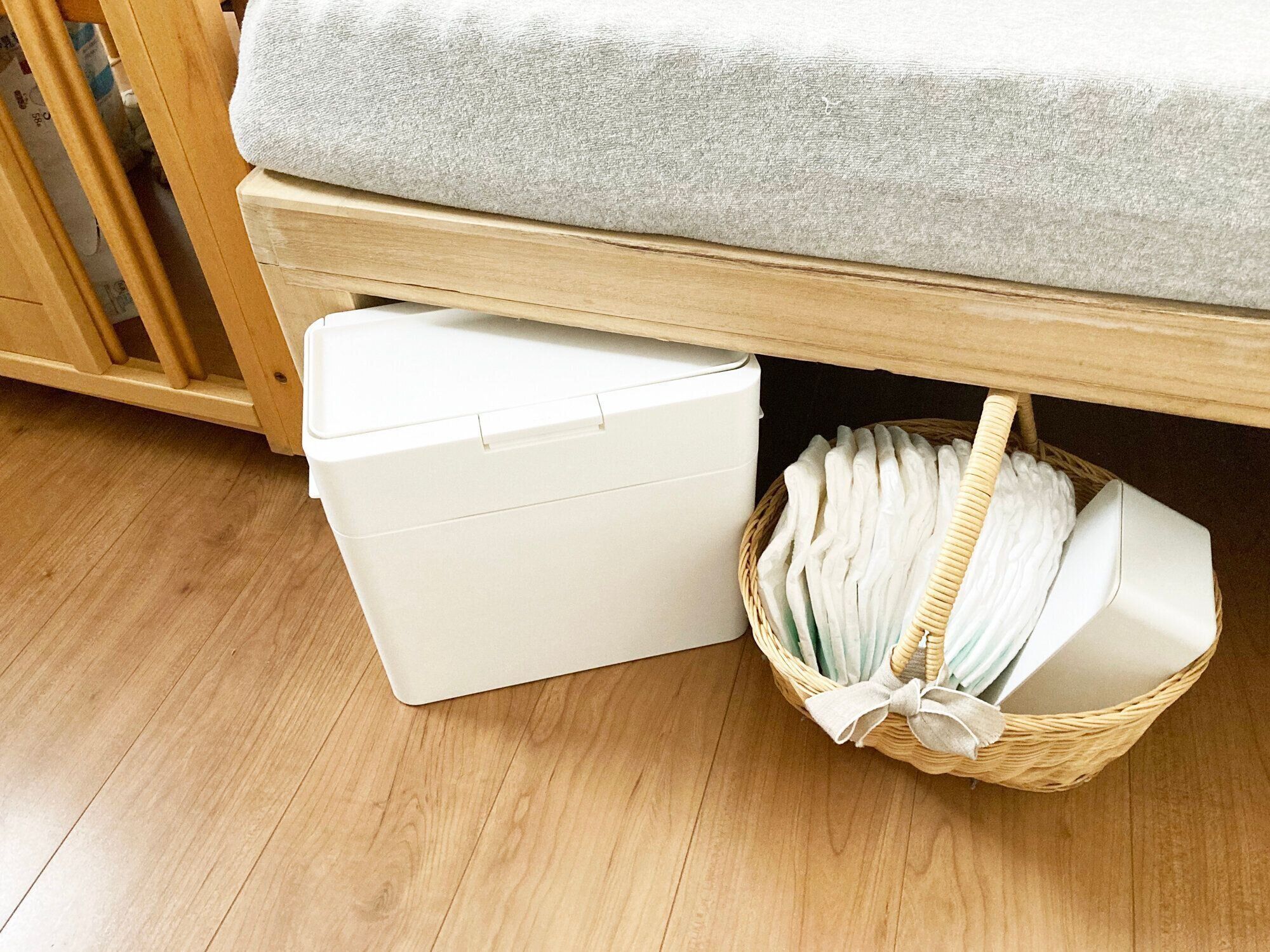 結婚式で使った思い出のバスケットにおむつを10枚程度入れて、ゴミ箱はライクイットの「シールズ9.5密閉ダストボックス」、おしりふきは無印良品の「ポリプロピレンウェットシートケース」に入れています。