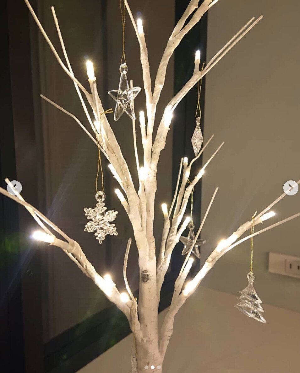 セリアで販売されている、アクリルオーナメントシリーズ。ayumiさんのお宅では白樺の木に飾っているそうです。ライトアップもされており、大人っぽい雰囲気になっていますね。