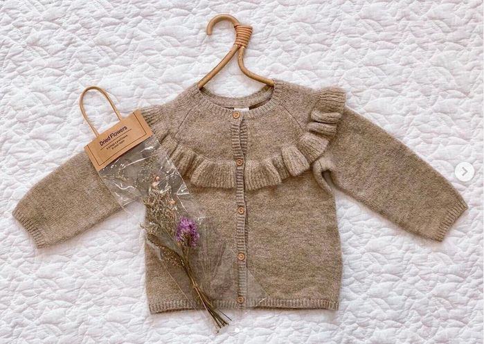 こちらは、yu_miさんがH&Mで購入したニットカーディガン。胸のフリルがおしゃれで素敵ですね。20%オフでゲットできたそうでママも大満足!かわいいワンピースなどと合わせてコーデしたみたくなるアイテムです。