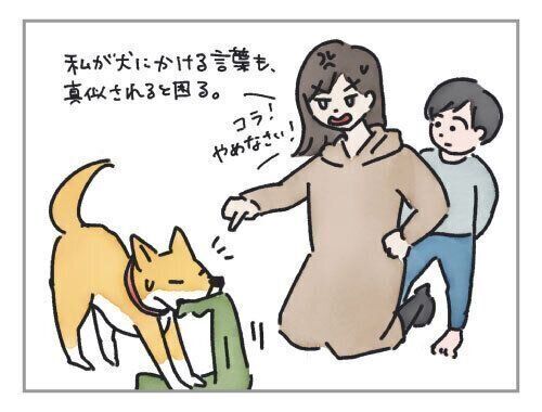 犬の行動そのもの以外に、私の犬に対する態度も、見られていそうで怖い。犬をしつける時は「ダメ!やめなさい!」みたいに強い言葉と態度で犬に話しかけたり、「よし!」みたいな言葉を使うことが多くなるのですが、これをよく見ている子ども。真似して、子どもが他の人に対して強い言葉を使わないかと、実はドキドキしています。