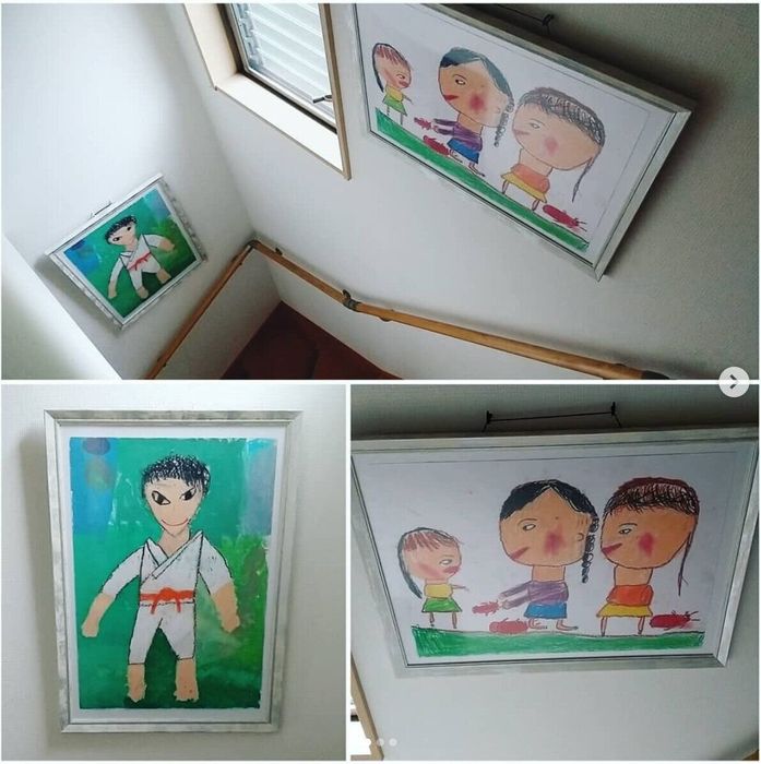 階段の壁に子どもたちの絵を飾っているというmakiさん。DAISOで買ったポスターフレームに絵を入れたそうで、四つ切り画用紙よりもふた回りほど大きいサイズなんだとか。こちらの方はフレームの色も気に入っているとのこと。
