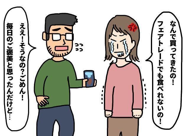 目の前で我慢しているチョコを食べる夫。