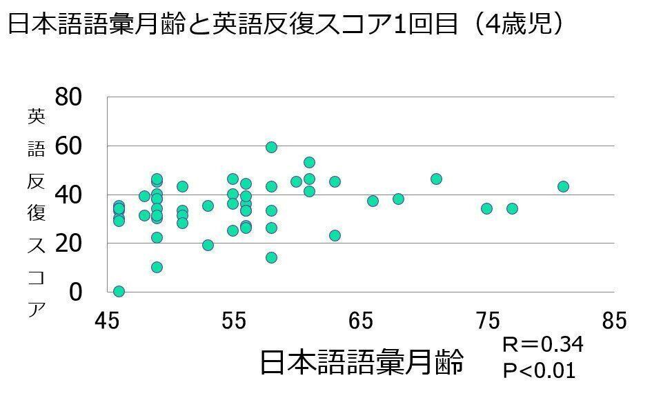 3歳〜6歳の子どもたち約200名を対象に実施した調査で、日本語の語彙力が高い子どもは、日本語の反復が上手にでき、さらに英語の反復も上手にできるという結果が出ました。