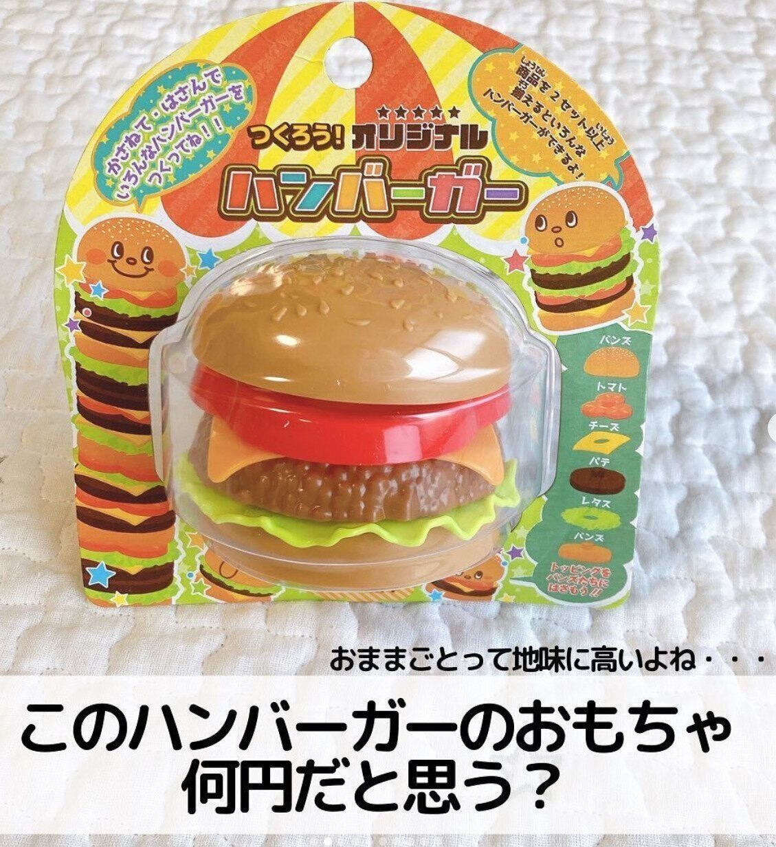 こちらのハンバーガーのおもちゃは、チーズやトマト、レタスなどのトッピングをすべてバラバラにできる優れもの。1セット110円で購入できますが、2セット以上買うとさらにたくさんの組み合わせを楽しむことができるそうです♪