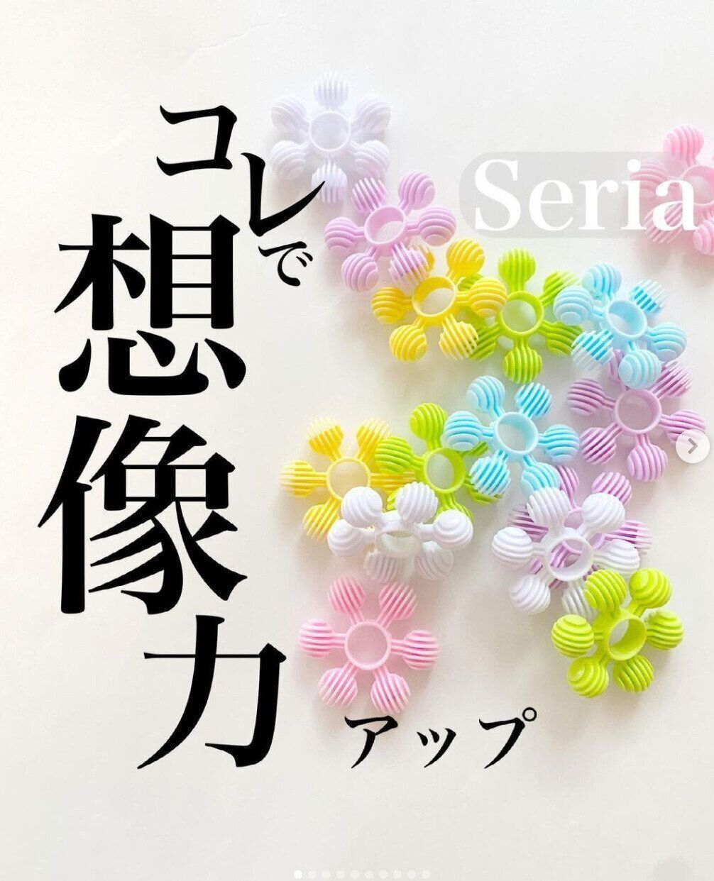 こちらはセリアで販売されている「スノーブロック」。花型のブロック同士をくっつけて遊ぶおもちゃですが、こちらのお宅では、ブロックに紐を通したり数の勉強に使ったりしているそう。1袋に15ピース入っており、子どもが自分で考えながら楽しめるおもちゃですね。