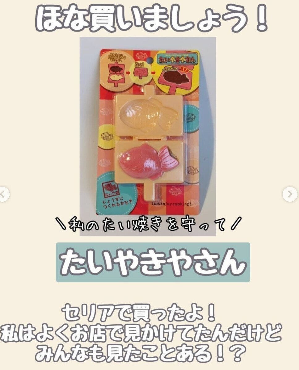 maruteteteさんが、たいやき好きな息子さんのためにセリアで購入したという「たいやきやさん」。おもちゃのパーツは皮と餡が別々になっており、付属の焼き型にセットすることで、簡単にたいやきが完成するそうですよ。