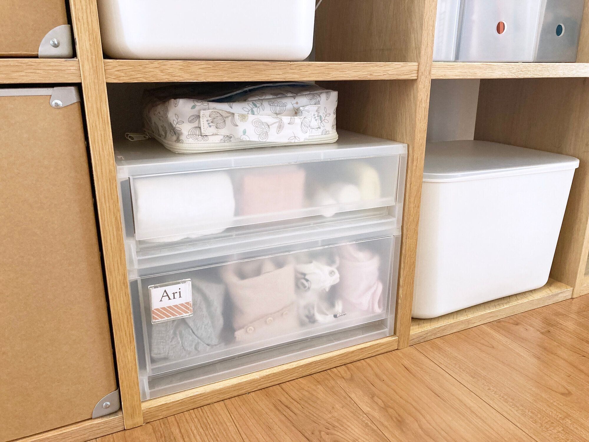 筆者宅では生まれてから半年はボックスタイプで収納していましたが、生後半年からずりばいして、中身を出せるようになってしまったので、引き出しタイプに変更しました。引き出しの場合は、大きい重いタンスではなく、小さめで軽めの衣装ケースや収納ケースがおすすめです。