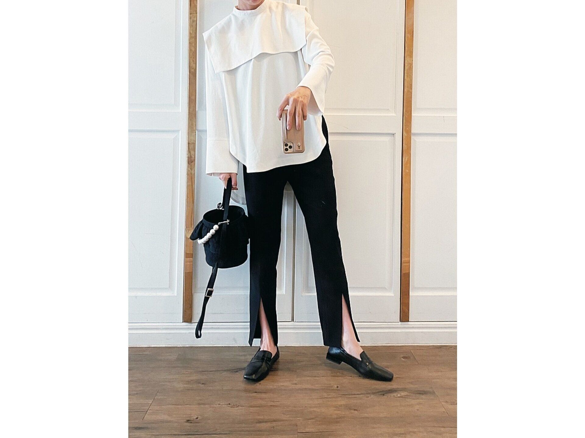コーデしなくても1枚で決まるブラウスがマイブーム。「コエル」のバケツバッグは、斜めがけもできるので、めいちゃんとのお出かけ時にも大活躍!
