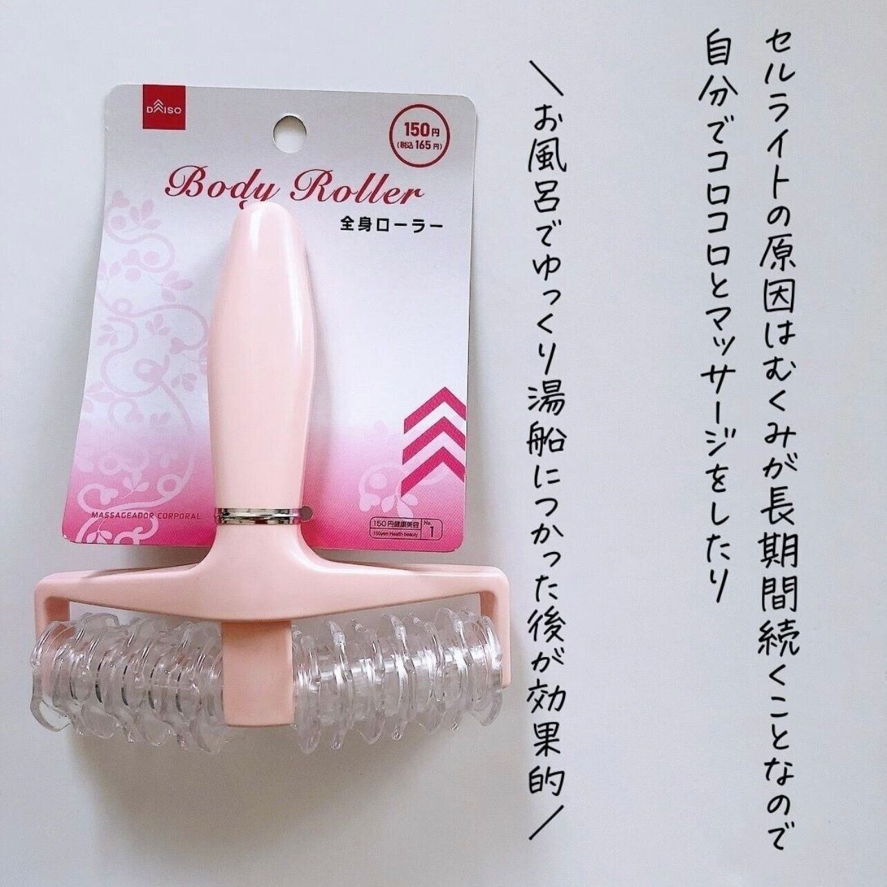 もかさんはダイソーで全身ローラーを購入したそうですよ。ローラーのカーブがふくらはぎや太ももに絶妙にフィット。1日頑張った脚にコロコロ転がしてむくみを取ってあげるのに最適ですね。ボディクリームと併用して使うのがおすすめなんだそう。こちらは165円商品です。