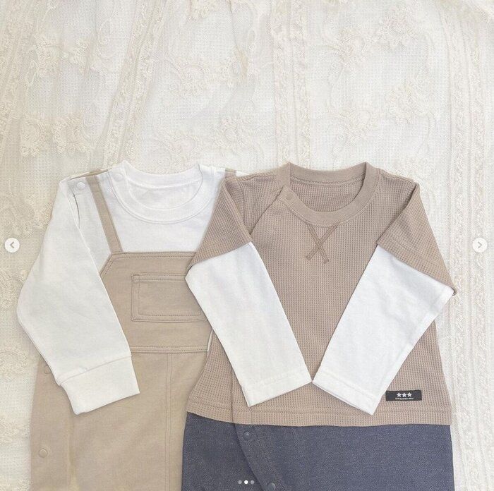 mbaby0801さんはこちらのセパオールを購入。可愛すぎる!とお気に入りの様子。上下とも別々で重ね着しているように見えますが、実は前開きタイプの一枚のお洋服なのです。とってもオシャレに着こなしていますね。