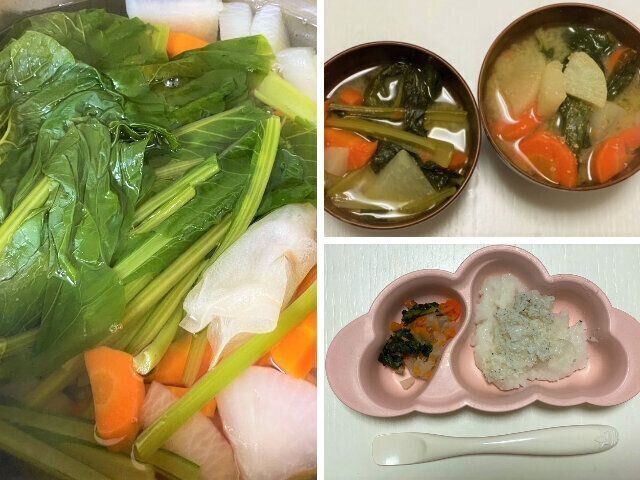 「大人用に具沢山のみそ汁を作って、みそを溶く前に、離乳食用に野菜を取り分けて、みじん切りにして食べさせています。だし汁で煮ているので、離乳食用は追加の味付けも不要なので簡単です」(Nさん)
