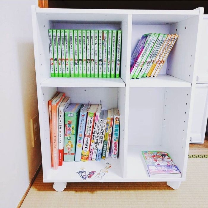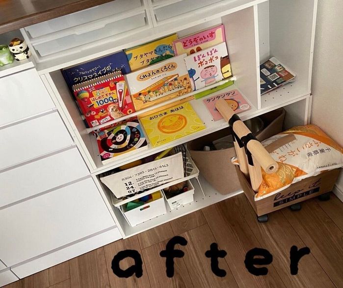 お子さんに本好きになってもらいたいmiruku712_さんは、「本はこの中に入るだけしか持たない」と決めて、ニトリのキャスター付きのボックスを本棚に。読書をしないときはコロコロと転がしてボックスごと押し入れの中に収納するそうです。