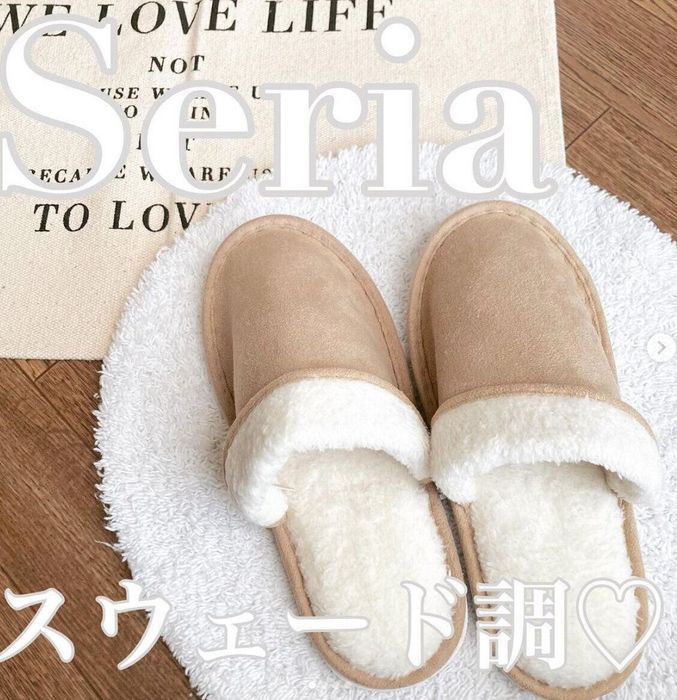 こちらは、maimaipapipuさんがセリアで発見した「カジュアルスリッパスウェード地」。スウェード調×ボア素材で、冬らしいデザインですね。お風呂上がりに素足のまま履くのも、ふわふわしていておすすめだそう◎