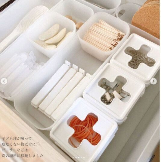 fufu.さんは小さいサイズのプルアウトボックスに、クリップや輪ゴムなどを収納しています。種類ごとに細かく分けて収納できるので、取り出しやすそう!見た目もすっきりしていますね。