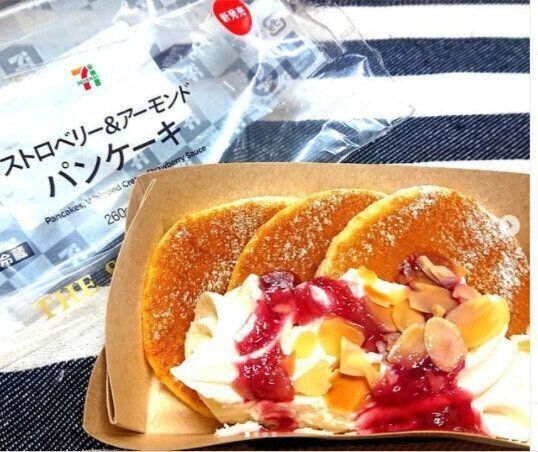こっこさんが購入したのは「ストロベリー&アーモンド パンケーキ」。薄くてふわふわの生地に軽いホイップクリームがのり、ストロベリーソースは甘酸っぱくて食べやすかったそう。こちらは280円(税込)の商品のようです。