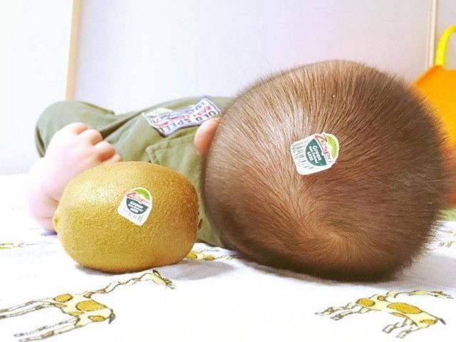 赤ちゃん時代ならではといえるのが、ベビーの頭をキウイに見立てた「#キウイ頭」。薄毛を存分に活かした(?)その写真は、毛並みといい、形といい、どっちがキウイ?となるほど。