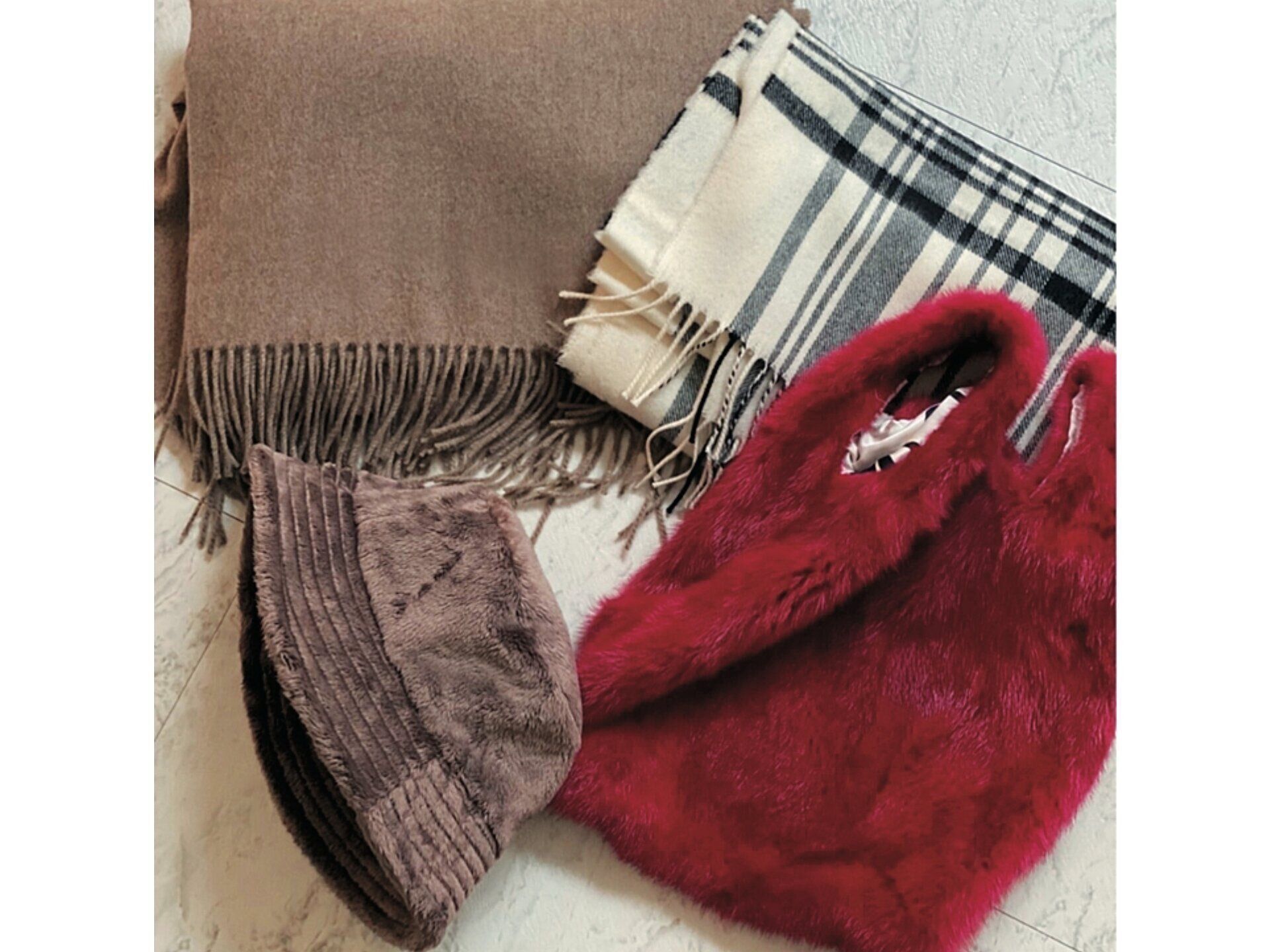 なめらかで肌触りがいい冬小物は大好き!チェック柄のストールは「johnstons of elgin」、赤のファーバッグは「SIMONETTA RAVIZZA」。