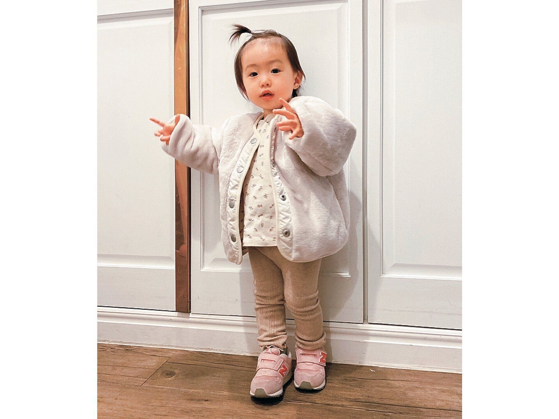 1才半ばになり、よりおしゃれの幅が広がって楽しい日々。この日のお出かけは、少しオーバーサイズ気味のふわふわジャケットを主役にコーデ。