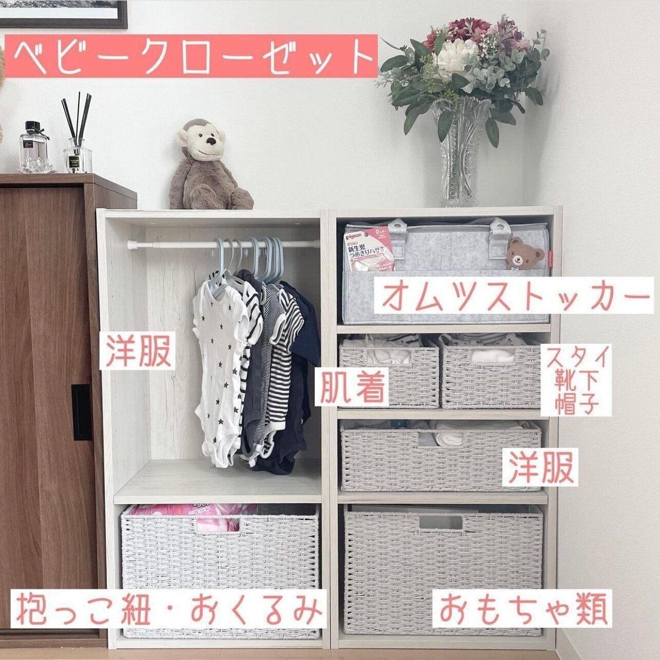 こちらは*mami*さんが作ったベビー収納。画像右側と中央のカラボはニトリのもので、成長してお洋服の丈が変わっても長く使えるように高さのあるタイプを選んだみたい。Nインボックスはホワイトとグレーの2色使いで、シンプルながらも程よくアクセントが効いていますね。