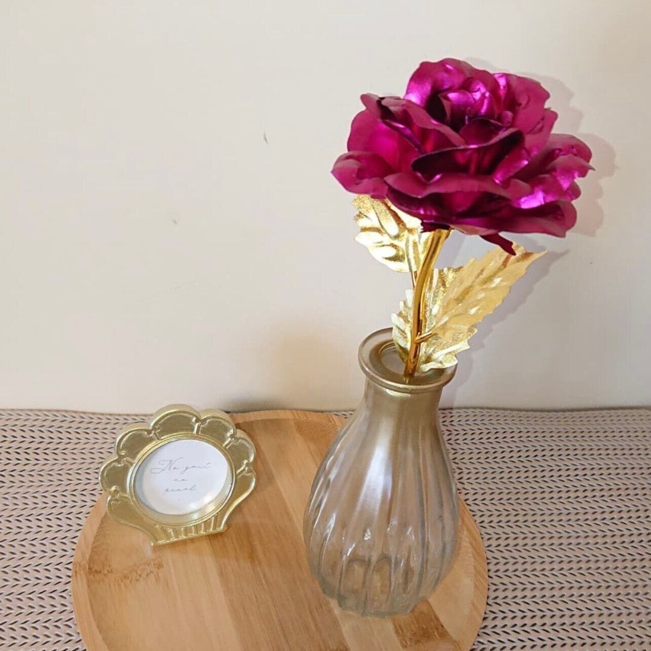 朱里さんがキャンドゥで見つけたのはアンティークローズ。深みがあるピンク色の花弁に、葉と茎がゴールドカラーなのが特徴的ですね。パッケージには「For Valentine」と印字されているようですよ。一緒に写ってるフォトフレームもキャンドゥのものみたい。