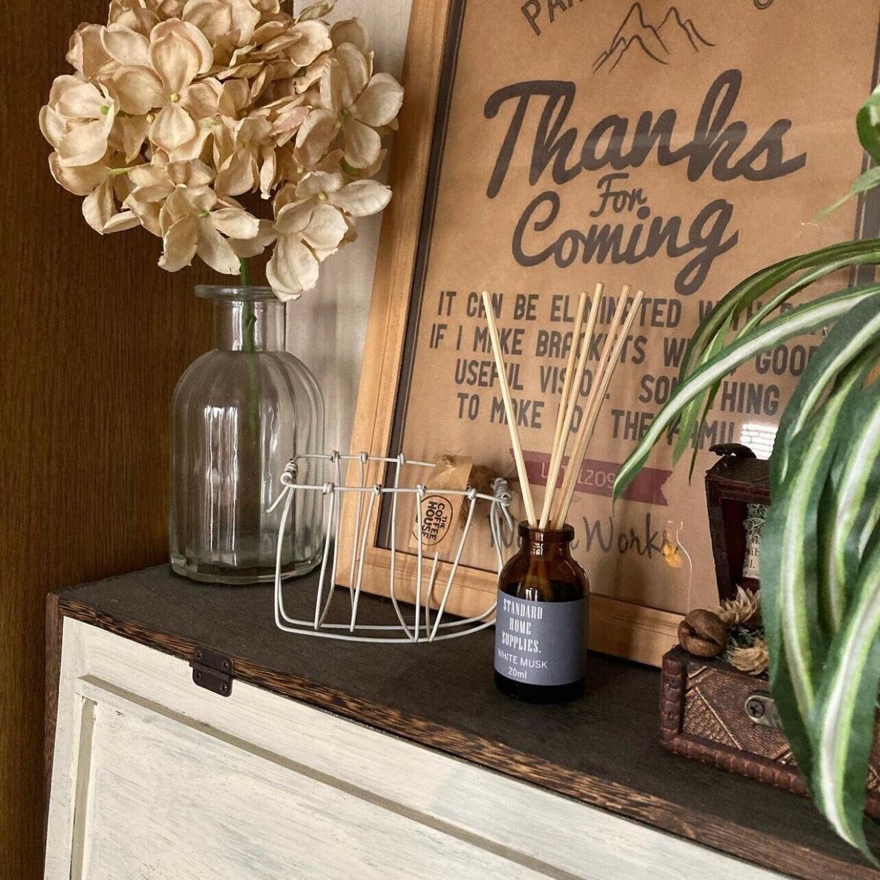 にいぼんさんはキャンドゥでアロマディフューザーを購入したそうですよ。ホワイトムスクのいい香りでお部屋が満たされると気分も上がりそう。スティックタイプのルームフレグランスは、お部屋の広さによってウッドスティックの本数を自由に調整できるので使い勝手がいいですよね。