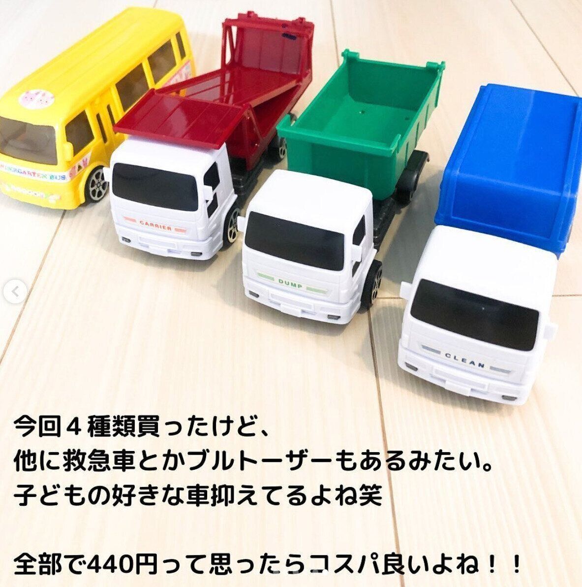 raiiiiiiii_10さんがダイソーで購入したのは、幼稚園バスやゴミ収集車など、4種類の車のおもちゃ。どれも大きめなので、子どもの手でも持ちやすそうですね。幼稚園バスには座席があったり、ゴミ収集車にはゴミを入れる場所があったりと、細かいところまで再現されているようです◎