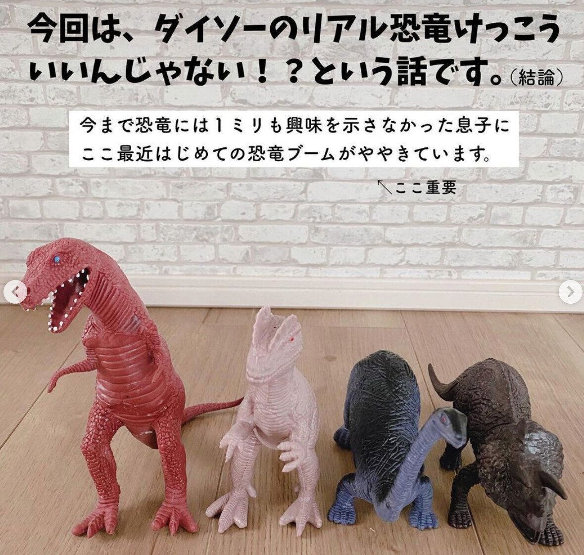 sugarsugar52_eさんが、恐竜に興味を持ち始めたお子さんのために購入したという「リアル恐竜」。こちらのお宅では、同じくダイソーで販売されている「ものしりカード きょうりゅう」と一緒に遊ぶことで、恐竜の名前を覚えているそうです◎