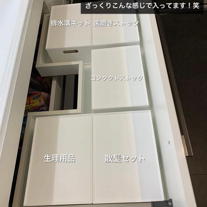 soyu_ismartさんのおうちの洗面台収納は引き出し式のようです。ここにニトリのNインボックスクォーターサイズ5つがジャストフィット。散髪セットや生理用品などざっくりと種類分けして収納しているみたい。ふた付きなので、開けたときにゴチャゴチャと見えないのがいいですね。