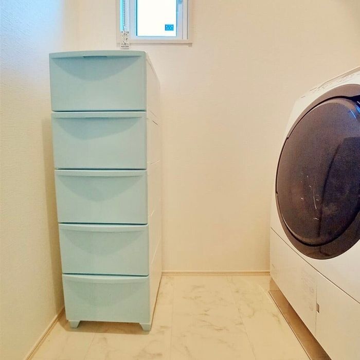 milk7milk.loveさんはランドリースペースに、ニトリの壁付きチェスト ピーディーシーヴォ 5段を設置。爽やかなターコイズブルーが空間のアクセントになっていますよね。乾燥機から出したらすぐにしまえるので、時短にも繋がりそう。
