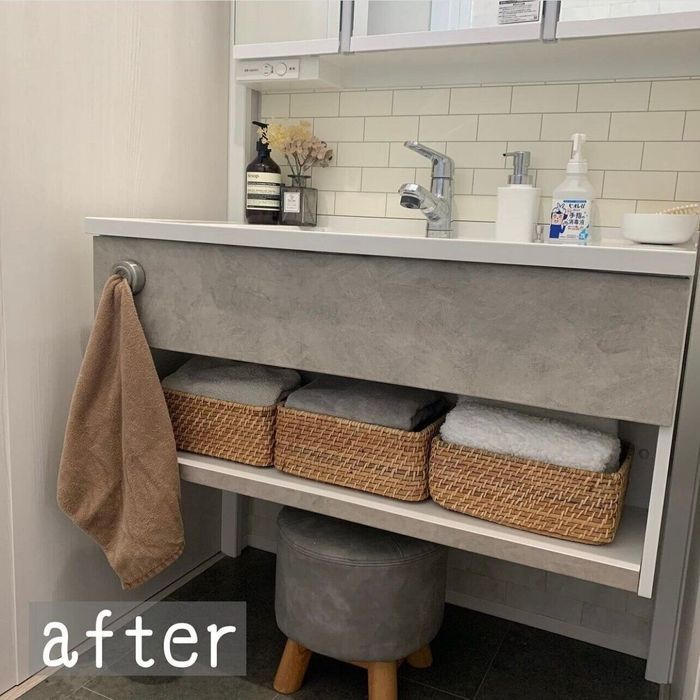 こちらの洗面台収納に採用されているのは、ニトリのラタンバスケット。3つ横並びにしてタオル類を収納するのに使用しているようですよ。洗面台の雰囲気とも合っていて素敵ですね。ちなみにこちらの洗面台は、はーちゃんままさんがカッティングシートでリメイクした力作。