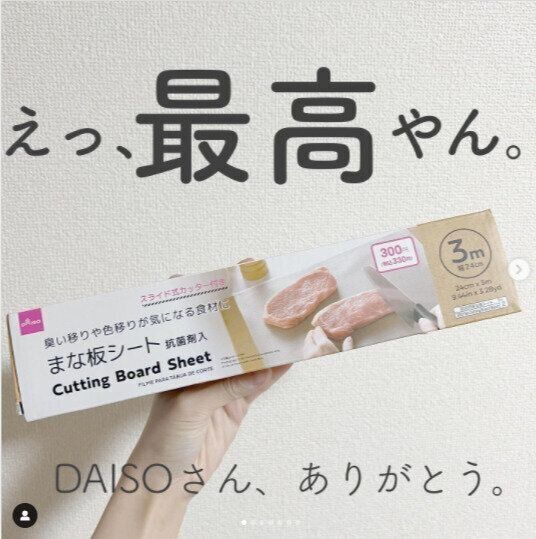 9ku.shufuさんがダイソーで購入したのは「まな板シート」。色移りや臭い移りを気にせずにまな板を使うことができるそう。シートも頑丈にできていて、包丁で切ってもシートが切れないのだとか。持っていると便利そうですね。
