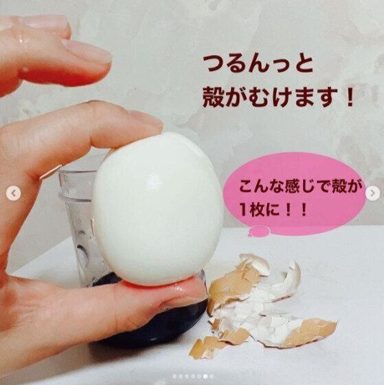まひさんがダイソーで購入したのは「たまごの殻むき」。ゆでたまごを容器の中にセットし、シャカシャカ振るだけで簡単にたまごの殻がむけてしまうのだとか。意外と手間がかかる殻むきも、これなら楽にできそうですね。