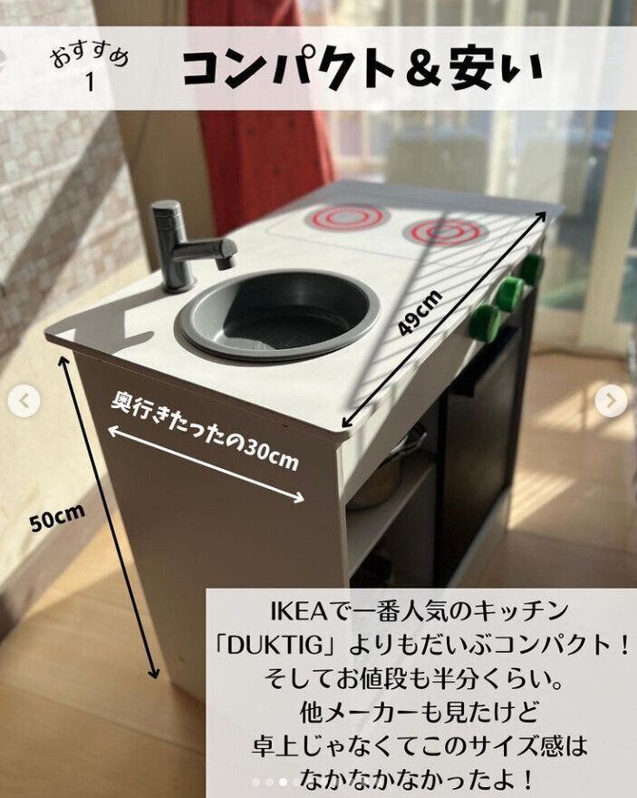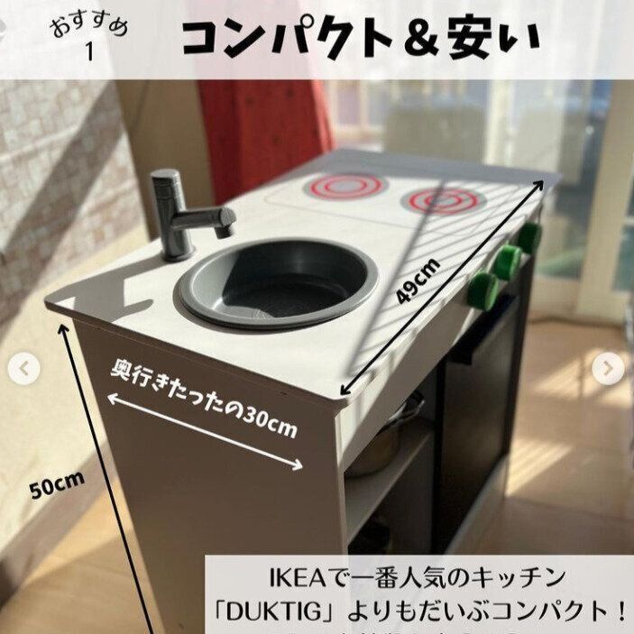 ちゃ豆さんはNYBAKAD(ニバカード)のおままごとキッチンを購入。実家に同居中で、大きいおもちゃはいらないかなと思っていたけど、コンパクトなサイズ感を気に入ってゲットしたそう。お子さんも朝起きると、まずこちらの場所に行くほど夢中なんだとか。コレは楽しそうですよね!