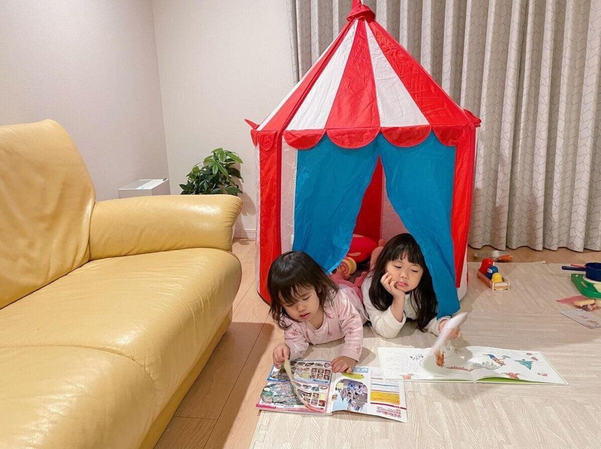 yousagi0813さんは、可愛らしいキッズテントを購入。こちらはお子さんたちのお気に入りの基地なんだとか。お二人のリラックスしている姿はとっても癒されますね。まさにキッズが喜びそうなアイテムですよね。