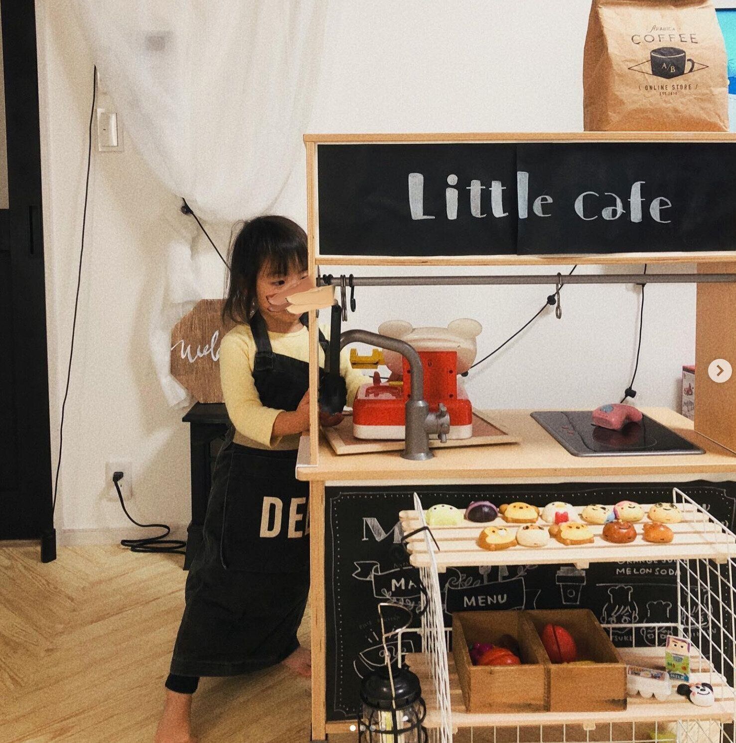 がおさんのお宅ではお子さんの遊びスペースをカフェ風にアレンジ!お買い物棚はセリアのすのこやDAISOのワイヤーネットを使って手作りしたんだとか。高さを変えられる作りになっているそうで、とても本格的ですよね。