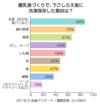 「離乳食の冷凍ストック」に関するアンケートによると、9割近くのママたちが、おかゆや食パンなどの主食を冷凍しているということがわかりました。次いで、ほうれん草や小松菜、ブロッコリーなどの“緑の野菜”が2番目に多く、そのあとににんじんや大根、かぶといった根菜が続いています。