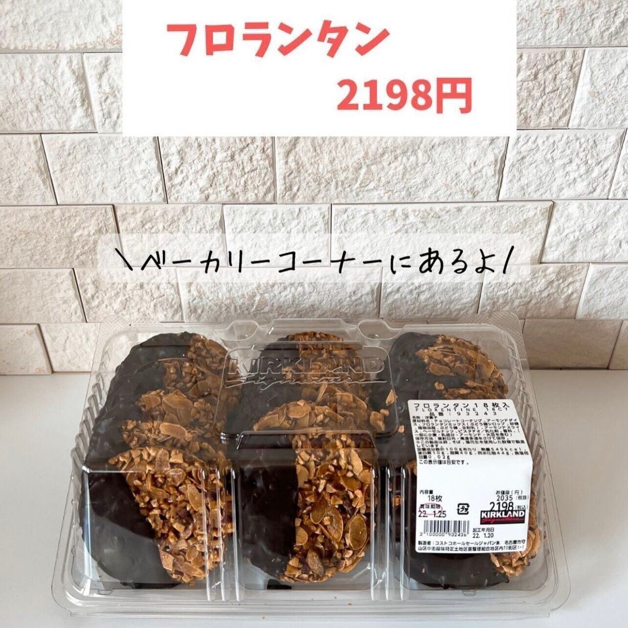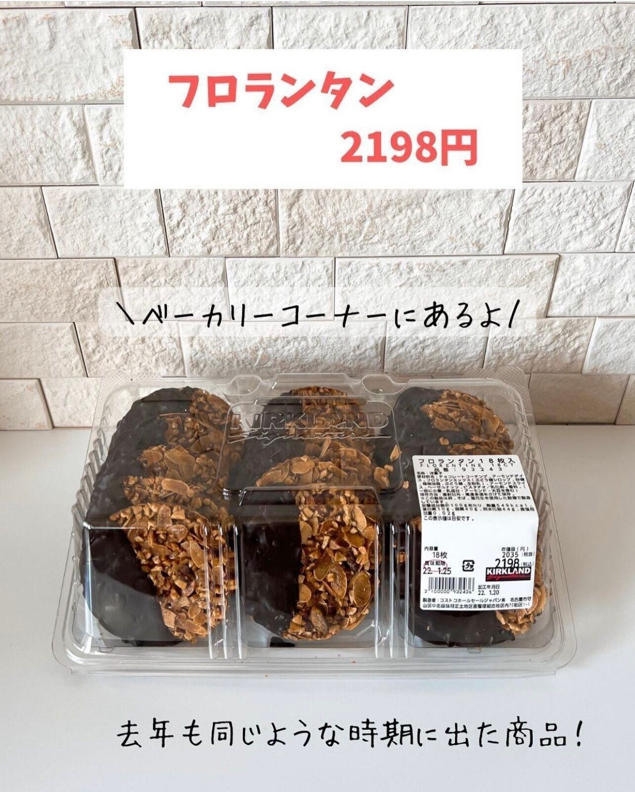 kotori_lifelogさんはコストコでフロランタンを購入したそうです。たっぷりのアーモンドスライス、ヘーゼルナッツ、ピスタチオがシロップコーティングされていて食べ応えが充分。チョコレートコーティング部分とで一度に二通りの味を楽しめるようですよ。