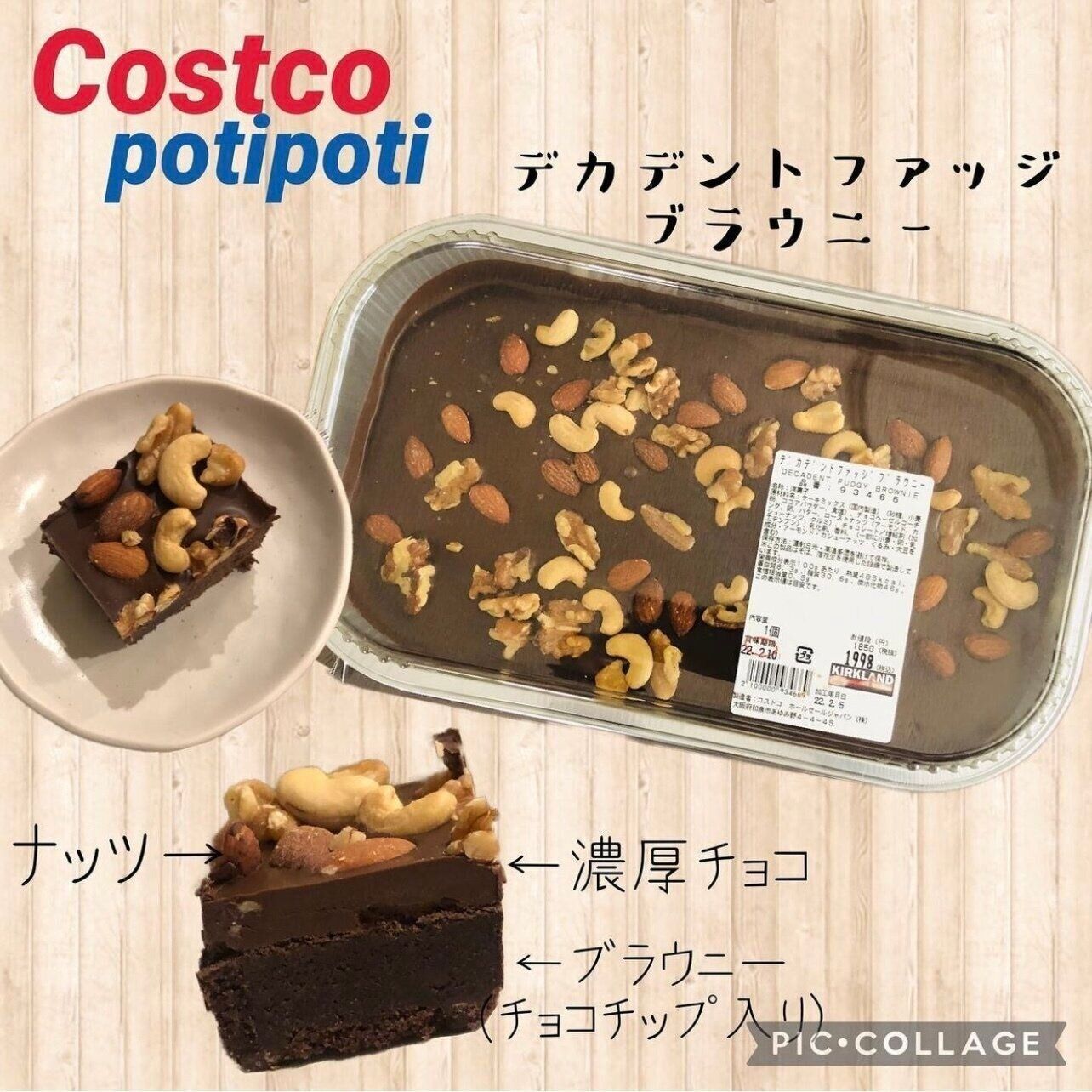potipoti212さんがチョコレート好きに特におすすめするのは、コストコの「デカデントファッジブラウニー」です。下部はチョコチップ入りのブラウニー、上部は濃厚なチョコレートにアーモンドやくるみなど数種類のナッツがトッピング。