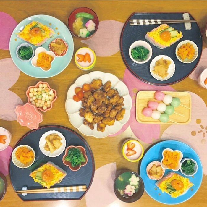 こちらはある年のkomugi_pointさん宅のひなまつりパーティーの様子。中央の唐揚げが乗っているお皿はニトリで購入したそうですよ。菊の花のようなデザインは日本のお祭りらしさを感じられますね。色味も上品なベージュでいろいろなお料理に活躍しそう。