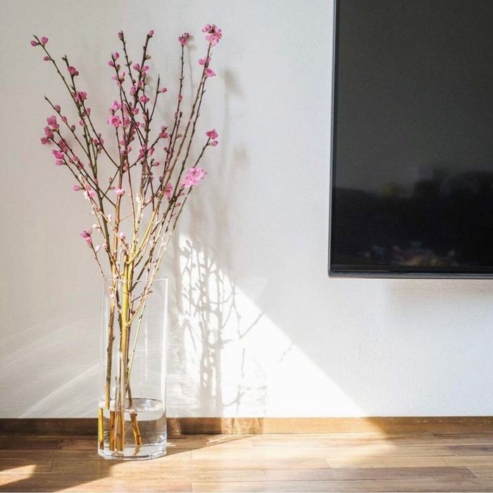 桃の花を活けるのにナミさんが選んだのは、ニトリの「フラワーベース シリンダー」です。S・M・Lの3サイズあるそうですが、背が高い枝物にはこちらのLサイズがぴったりなんだそう。シンプルなシルエットなので桃の花がよく映えますね。