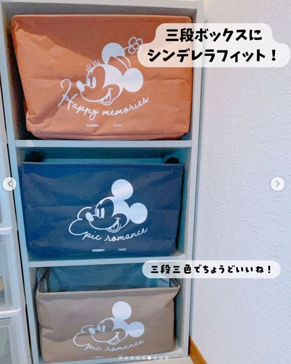 ミッキーとミニーのイラストが可愛いこちらのアイテムは、ダイソーの「布製ストレージボックス(ミッキー&ミニー)B」。miyu_yanenさんは、3段ボックスに入れて使っているそうですよ♪ こちらは1点あたり、330円で販売されているようです。