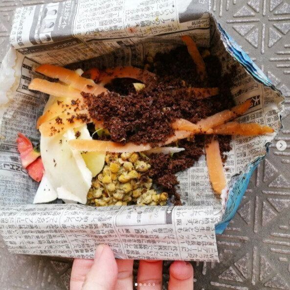 KANAKOさんは新聞紙で作ったゴミ箱に生ごみを集め、水分を取ってから段ボールのコンポストに入れているそう。段ボールでできるのはお手軽でよいですね。どんなふうに変わっていくのか楽しみ!