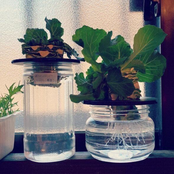 ゾンの素人栽培さんはキャベツの芯を水耕栽培しています。根や葉がどんどん出てきて大きくなっていますね。海苔の容器やキムチの容器を再利用し、容器の上にはダイソーのカラーボードを加工して使用しているそう。キャベツの成長を見るのも楽しそうですね。