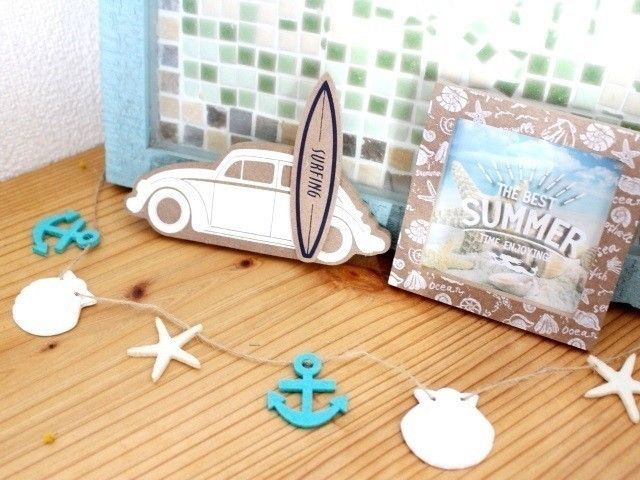 車とサーフボードが一体化になったウッドオブジェ。水色タイプもあり、さわやかな色合いながら、メンズ要素をミックスできます。