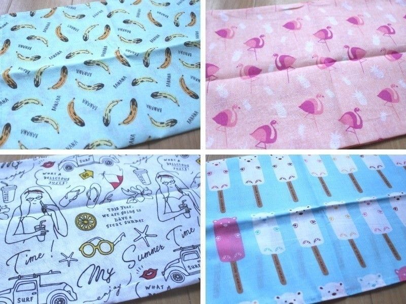 (左上)手ぬぐい南国風バナナ33×90cm、(右上)手ぬぐいアニマルフラミンゴ33×90cm、(左下)手ぬぐいアメリカンサマー33×90cm、(右下)手ぬぐい白くま33×90cm