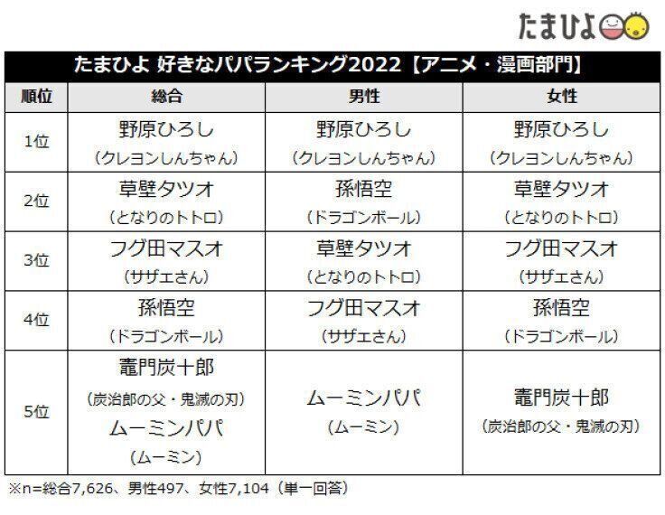 ベネッセコーポレーションの『たまごクラブ』『ひよこクラブ』が、6月19日の父の日を前に《パパに関する調査》を実施しました。子育て世代のママ・パパ7,626 人が選んだ好きなパパランキング《芸能人・著名人部門》は杉浦太陽さんが1位に。そして、《アニメ・漫画部門》では、野原ひろしさん(クレヨンしんちゃん)が2653票を獲得し、トップに輝きました。今回、個性的なキャラクターが並んだ《アニメ・漫画部門》に注目してみました。